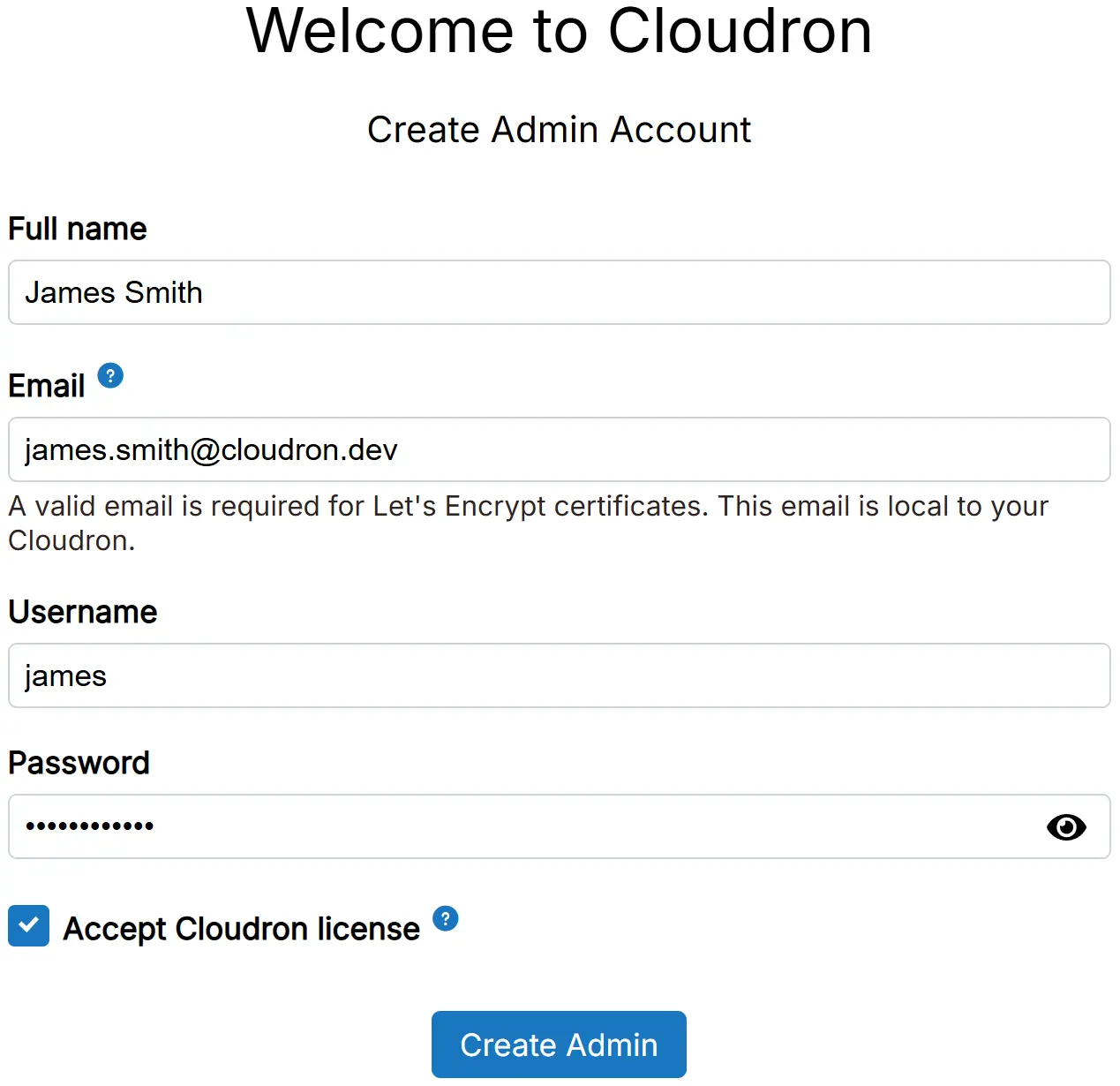 Enter the adminstrator username, email and password for Cloudron.