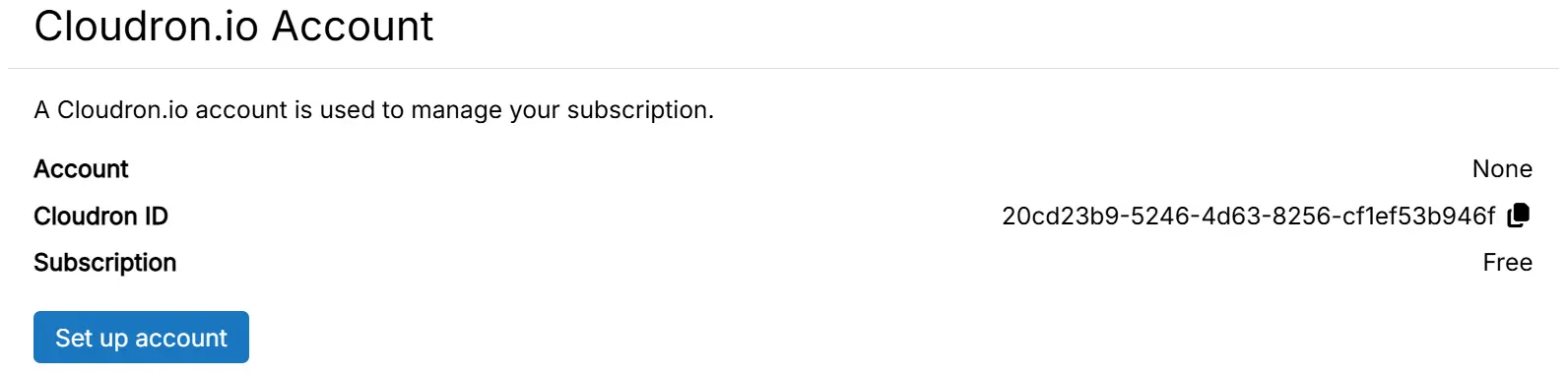 you will able to create a cloudron.io account by clicking Set up account button. This account is