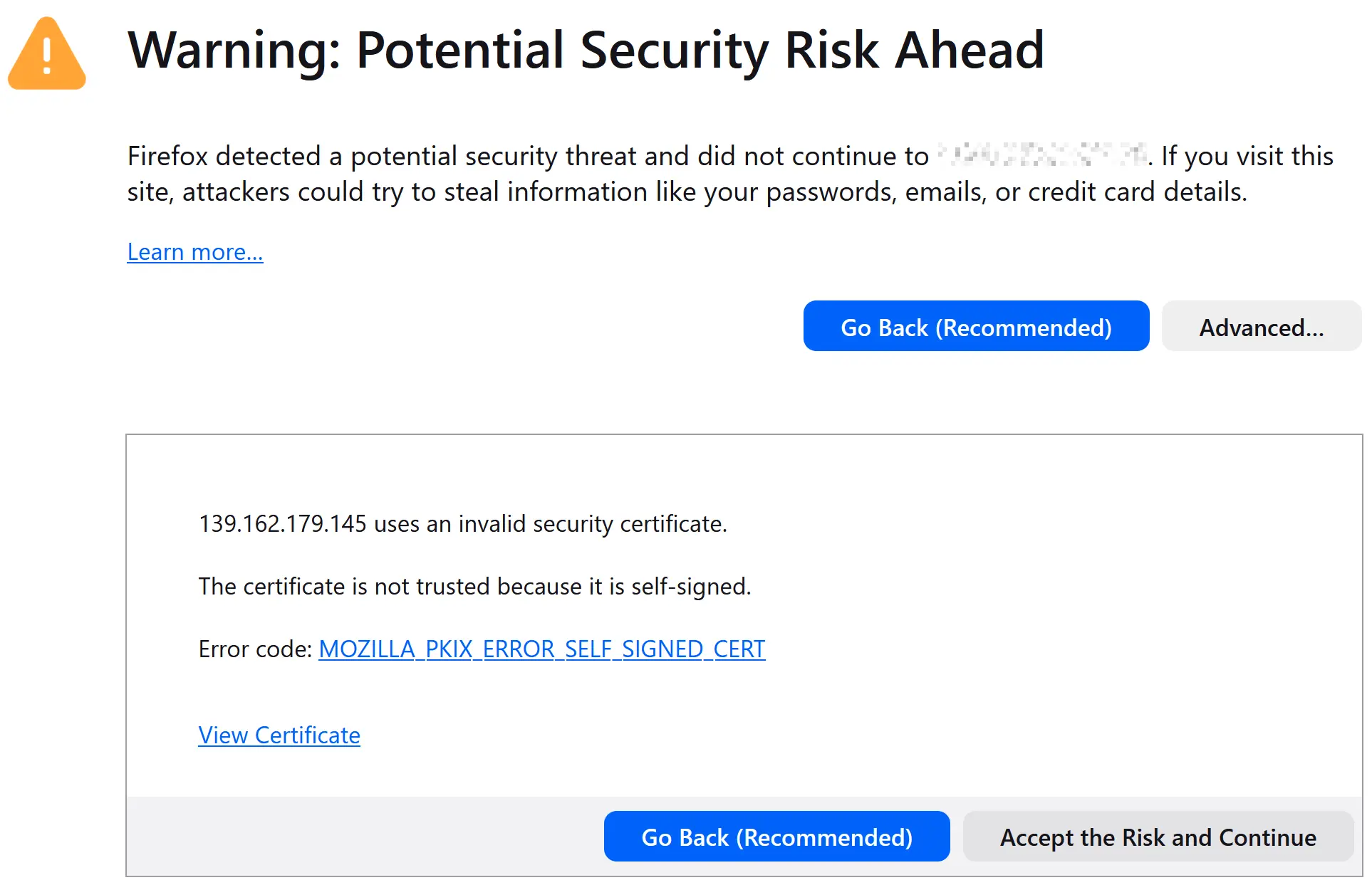 In Firefox, click on Advanced, then Accept the Risk and Continue.