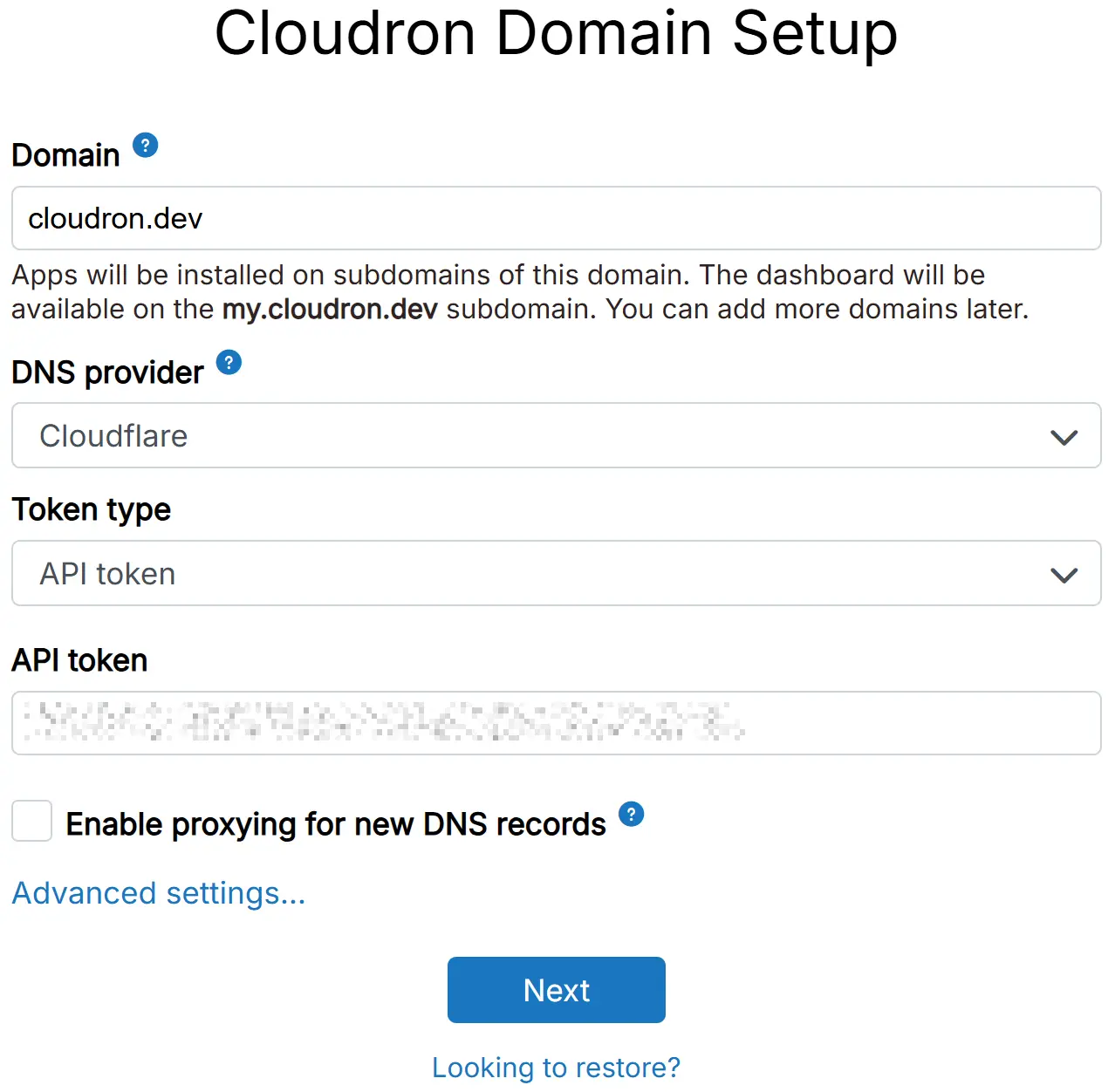 Once DNS is setup, Cloudron will redirect to https://my.example.com. The browser address bar