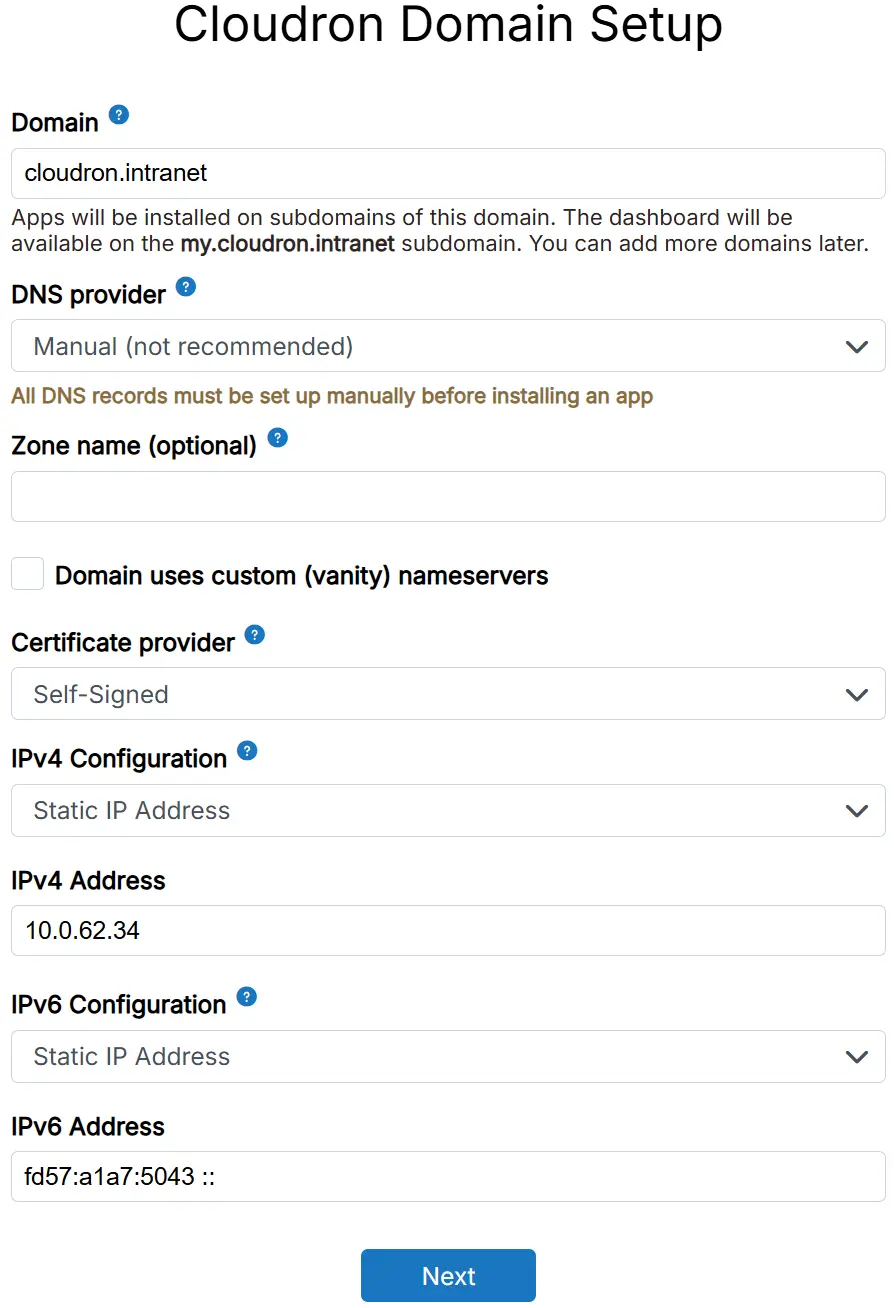 By default, Cloudron uses the public IPv4 / IPv6 for configuring the DNS. For intranet setups, this will most likely be incorrect.