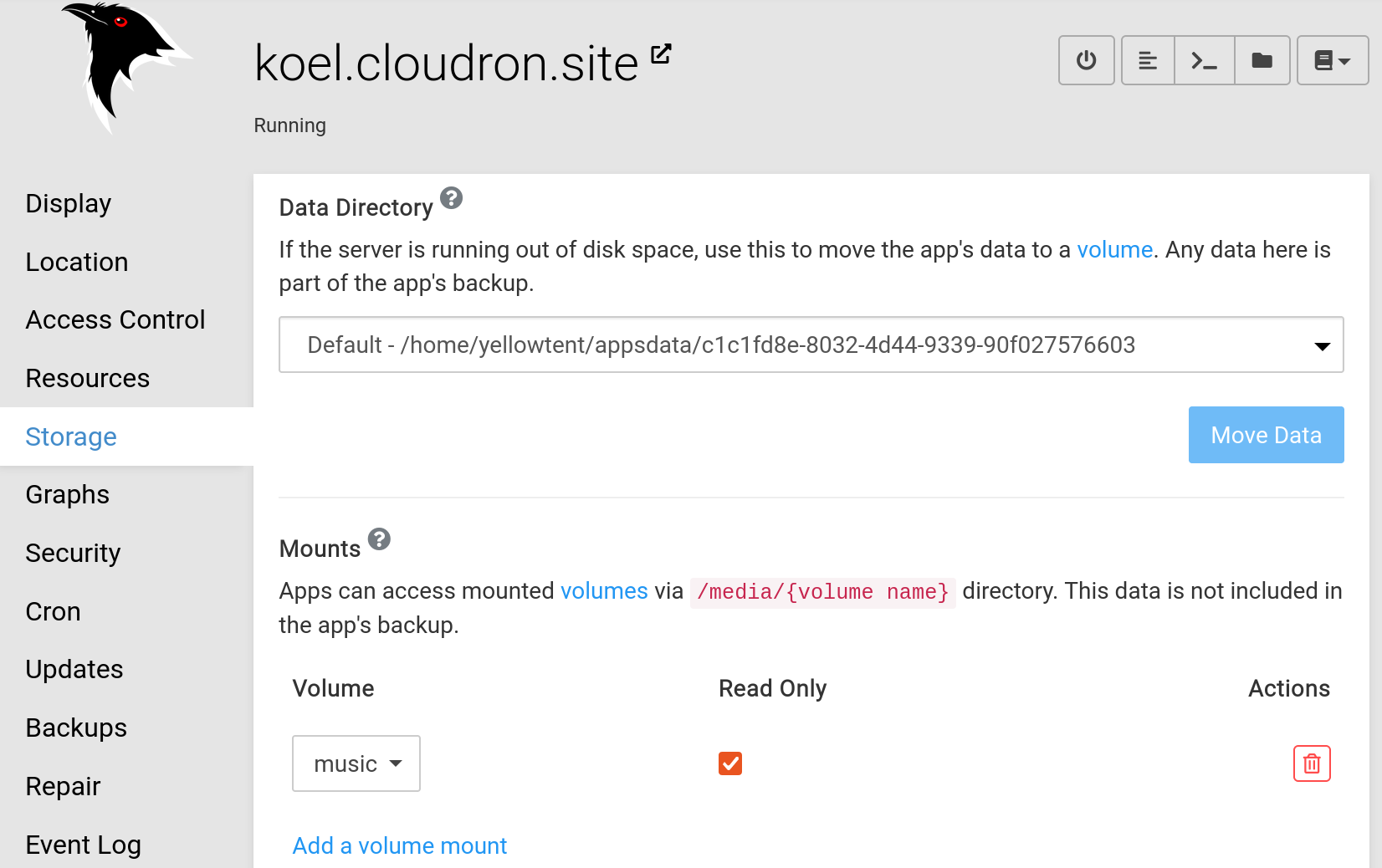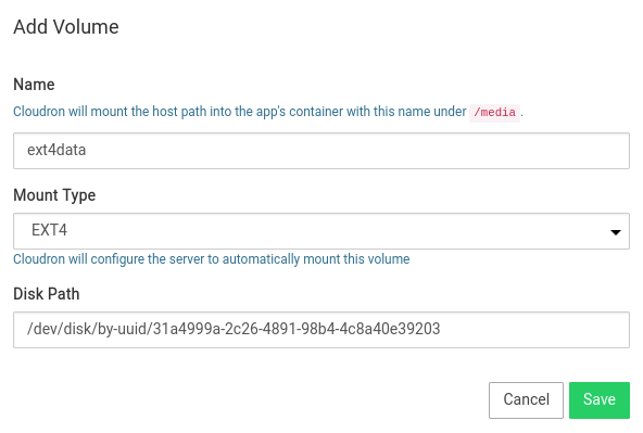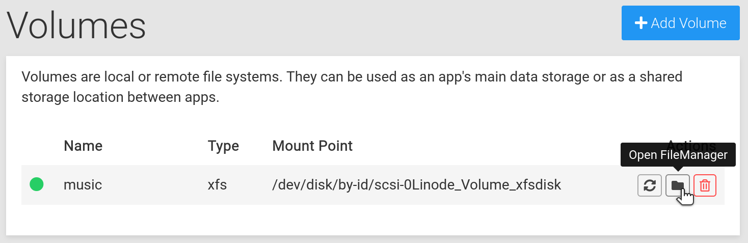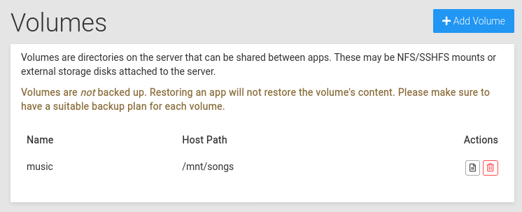 Once added, the volumes can either be used as an app's data directory or be mounted into one or more apps.