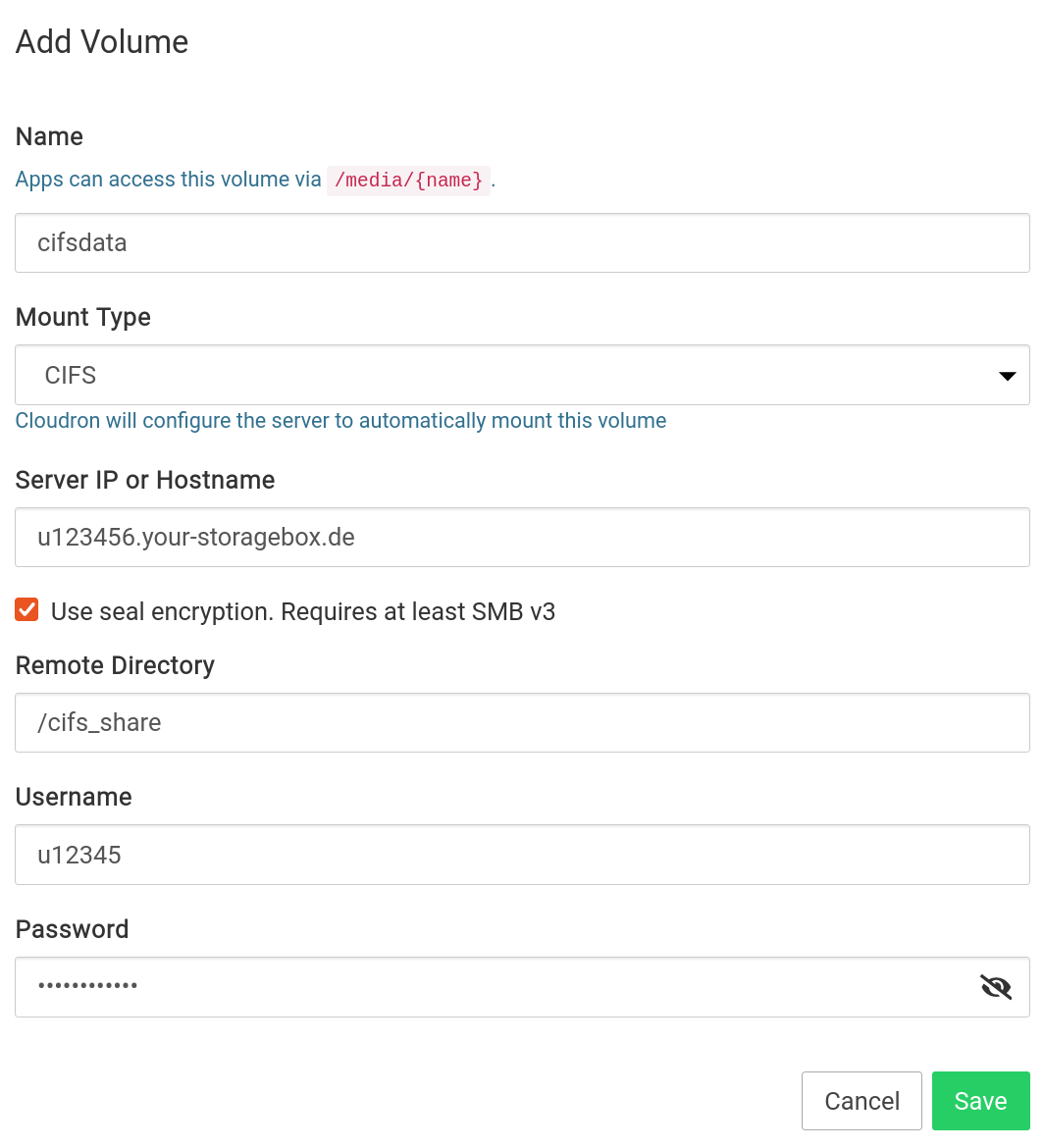 The CIFS mount type is used to mount CIFS shares. Note that, unlike EXT4 and NFS mount types, CIFS does not have a concept of users and groups. This makes it unsuitable for use as an app's data directory but will work fine for volumes and backups.