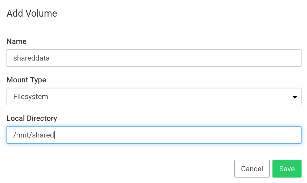 Only volumes with Mount Type EXT4 and NFS can be used as the data directory, as other Mount Types do not properly support file permissions.