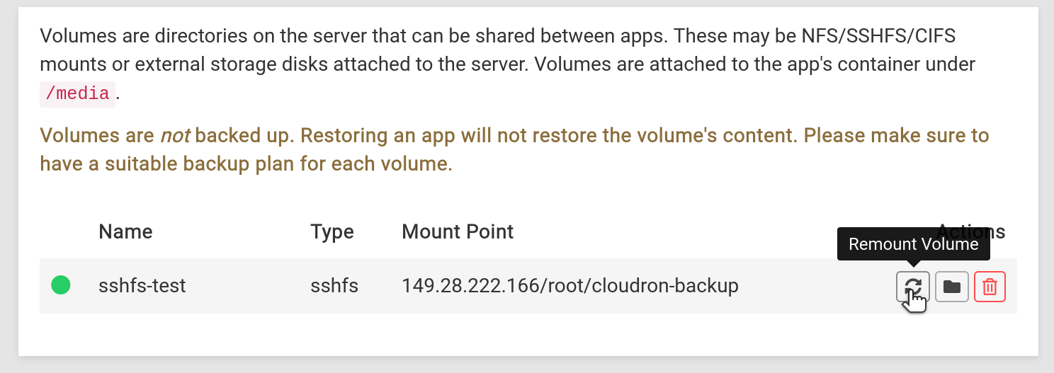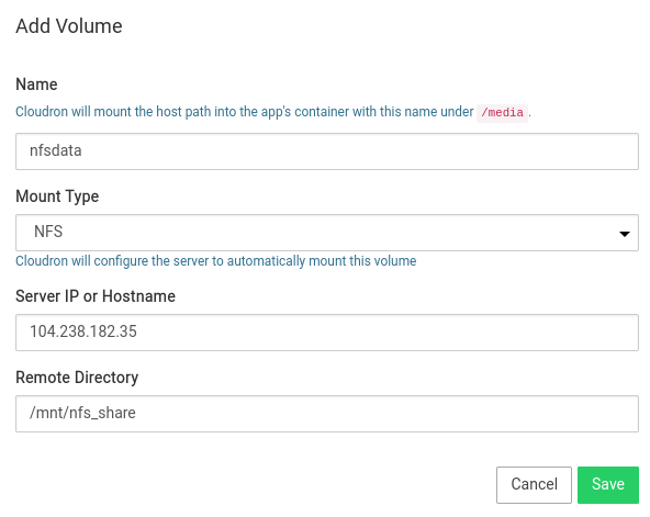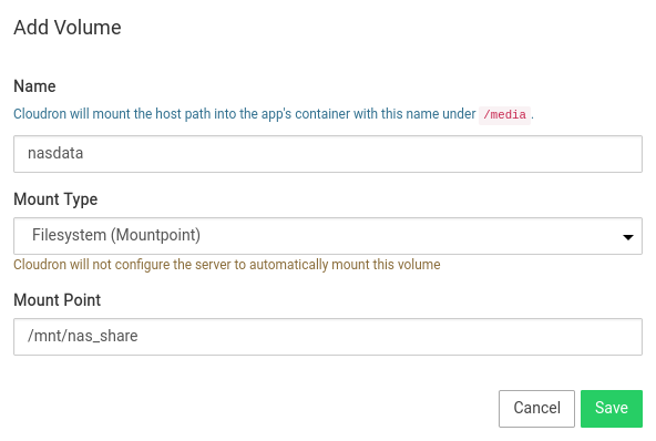 Cloudron supports a variety of mount types. When using a mount type other than No-op, Cloudron will setup systemd mount config files