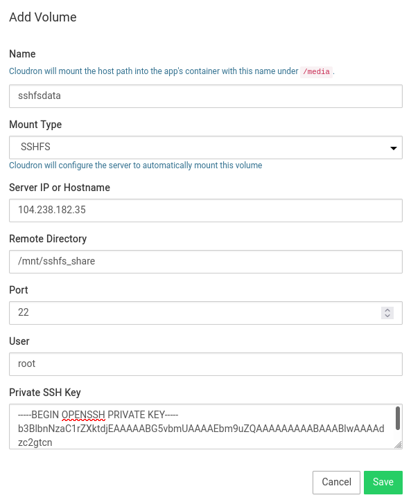 Cloudron does not support setting SSHFS volume as an app's data directory but will work fine for volumes and backups.