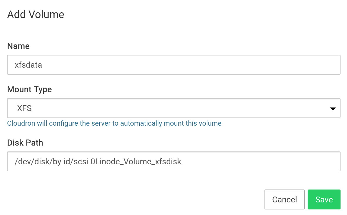 The XFS mount type is used to mount external hard disks or block storage. To add an external XFS disk, first make sure the